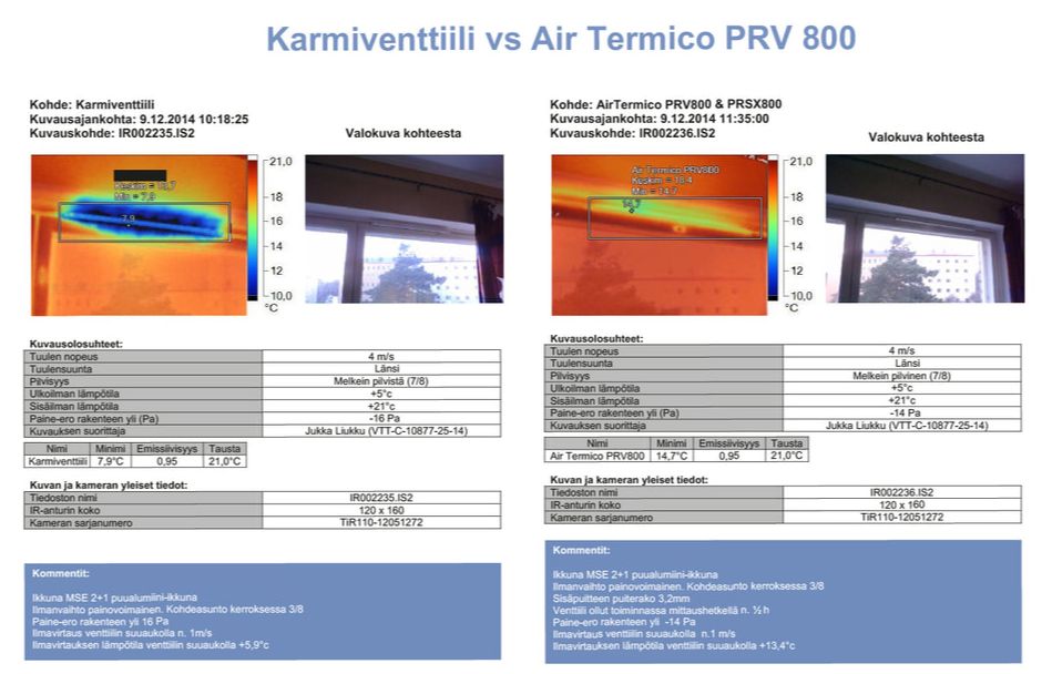 Tuloilman lämpötilat Air Termico -tuloilmaikkunaventtiilissä ja perinteisessä karmiventtiilissä.